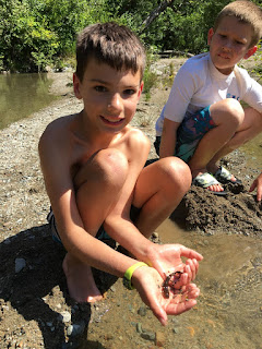 We asked the camp host where to go for a river with a beach and he directed us to a bridge on an abandoned highway. We walked down to the water and found a jewel of a location where the water wasn't too deep or fast moving. Easton looked in the water and saw a newt or salamander creature moving. He bravely scooped it up and we spent the next two hours making a newt zoo.